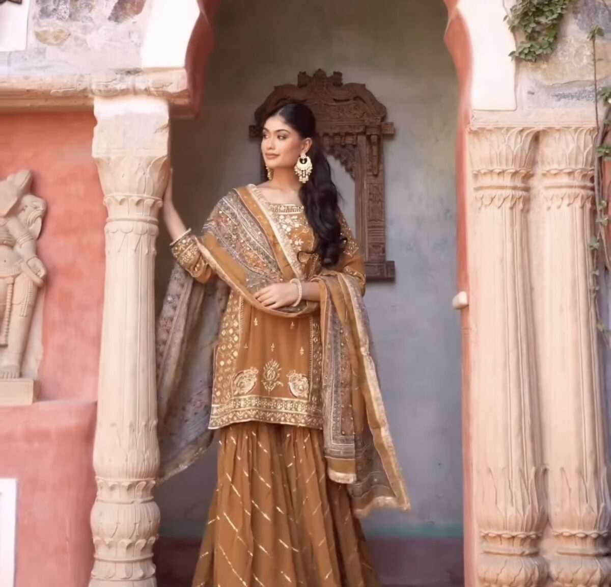 Dupatta ka digital print aur mirror work next level hai! Party wear ke liye perfect choice hai.