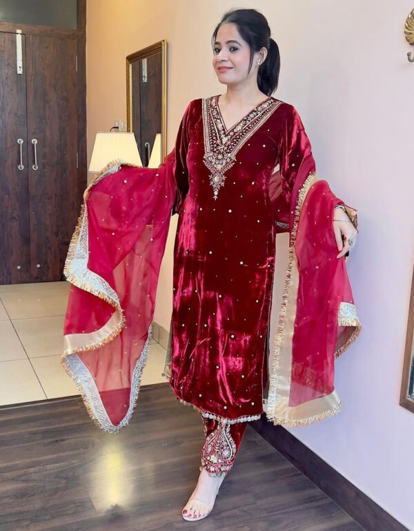 Regal Maroon Velvet Ensemble with Embroidered Dupatta