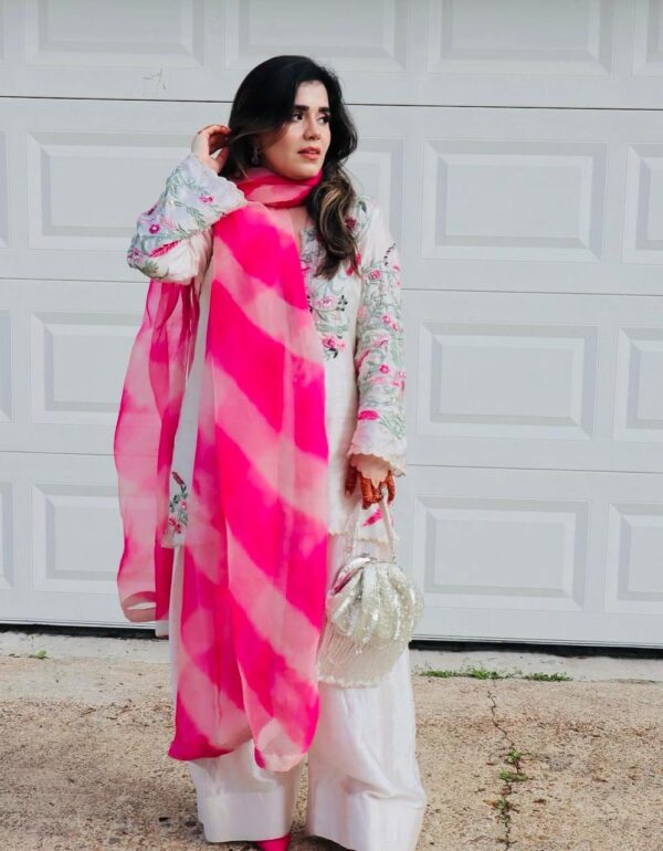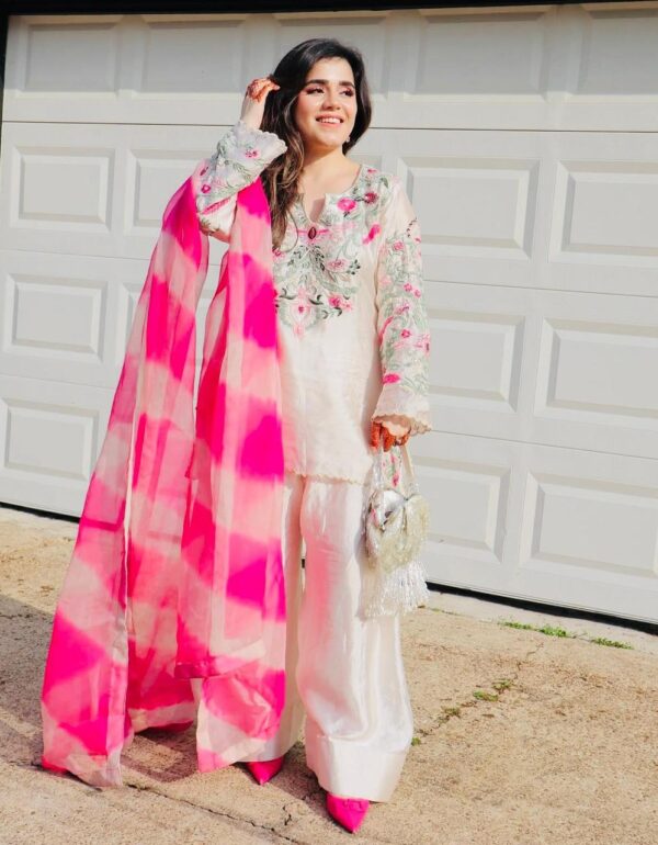 Yeh Gharara set bohot hi classy lag raha hai! Dupatta ka print aur lace border kaafi unique hai. Sabko pasand aaya.