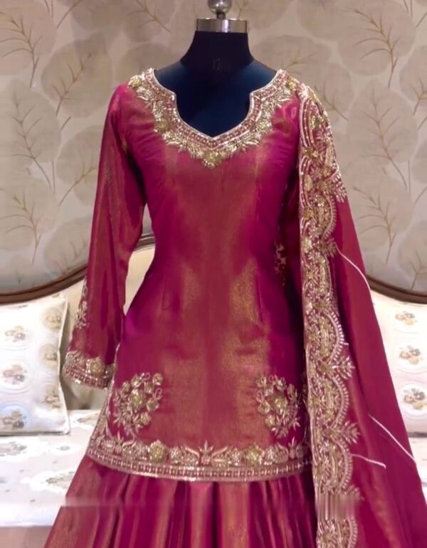 • Fabric: Premium Two-Tone Roman Shimmer Silk with Full Sleeves & Embroidery