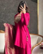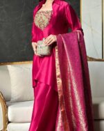 Magenta color aur embroidery dono zabardast hai. Salwar ka style alag lagta hai, aur dupatta bhi kaafi heavy hai.