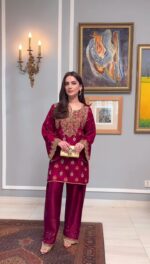 Elegant magenta velvet suit with rich gold and multi-color embroidery on kurta and trousers. Festive and luxurious. Introducing our Magenta Velvet Embroidered 2-Piece Suit, a stunning choice for your ethnic wear collection. This set features a beautiful short kurta and matching trousers, both crafted from soft, luxurious velvet in a deep magenta shade.