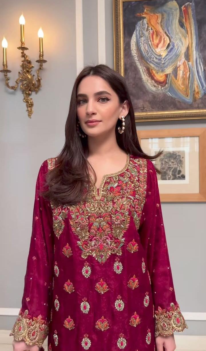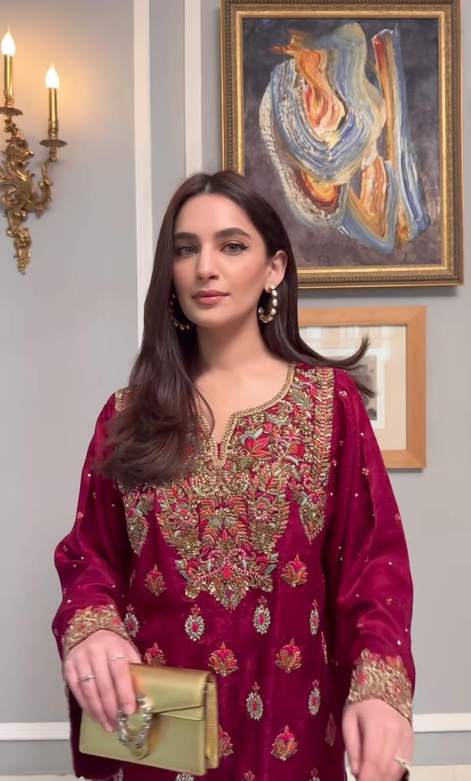 Elegant magenta velvet suit with rich gold and multi-color embroidery on kurta and trousers. Festive and luxurious. Introducing our Magenta Velvet Embroidered 2-Piece Suit, a stunning choice for your ethnic wear collection. This set features a beautiful short kurta and matching trousers, both crafted from soft, luxurious velvet in a deep magenta shade.