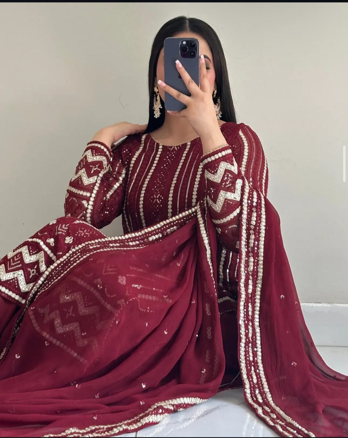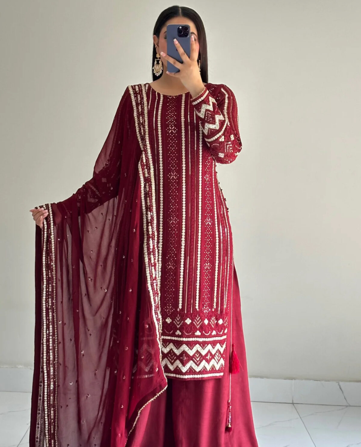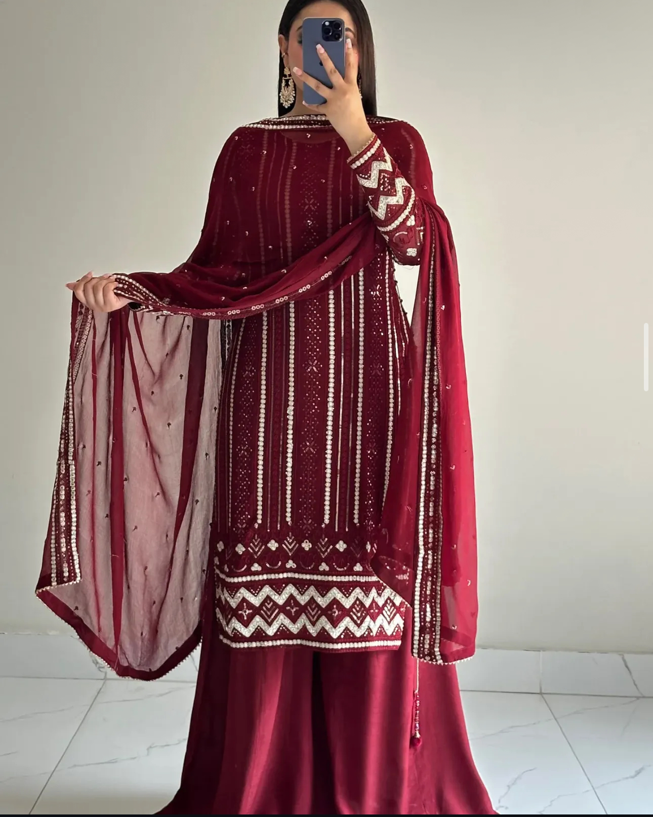 Top Fabric :- Heavy Faux Georgette With Heavy Embroidery Sequence Work With Diamond Hand Work Full Sleeve Top Inner :- Heavy Micro Cotton Top Length :- 51-52 Inch (FULLY STITCHED READY TO WEAR) Bottom Fabrics* :- Heavy Faux Georgette With Elastic Plazzo Length* :- 40-41 Inch (fully stitched)* Dupatta Fabric :- Butterfly Net With Embroidery Sequence Work With Lace Border Weight : 1 kg