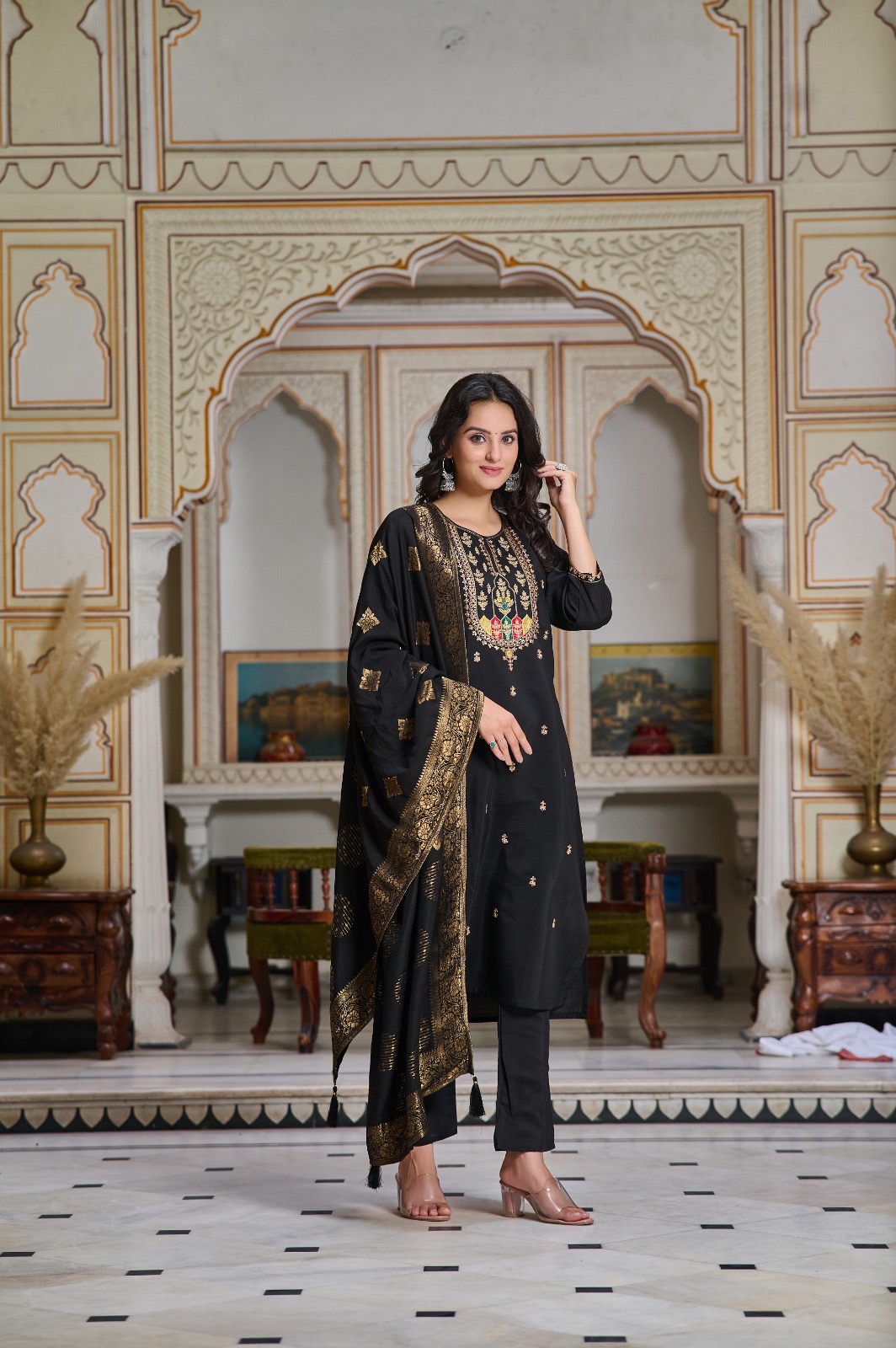 The Meherbanu Royal Chanderi Silk Set is a luxurious ensemble that exudes timeless elegance and regal charm. Crafted from rich Chanderi silk, this set features intricate embroidery and delicate detailing, perfect for those who appreciate traditional craftsmanship with a touch of royal sophistication. Ideal for special occasions, this outfit is a statement of grace and grandeur.