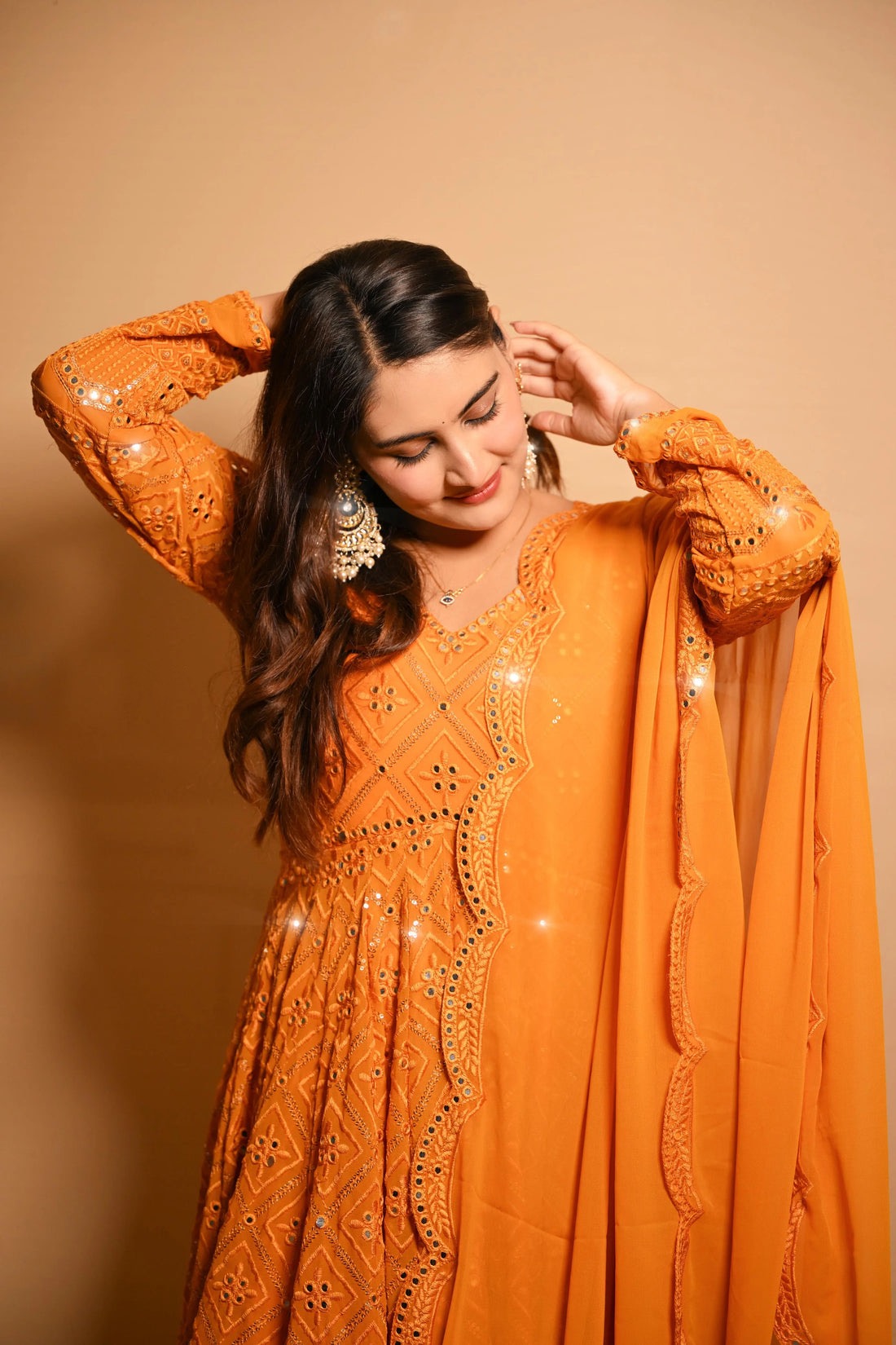 Absolutely stunning Anarkali! The mustard color is so vibrant, and the mirror work adds a luxe touch. Perfect for weddings or festive occasions.
