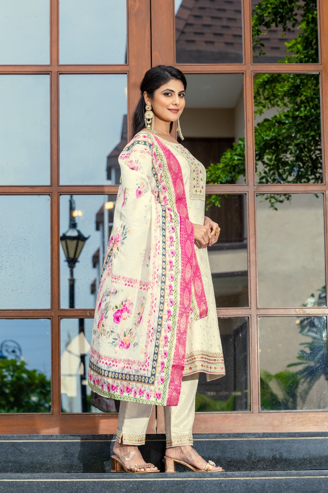 The Ivory Luxe Ensemble is absolutely stunning! The embroidery is so detailed, and the fabric feels really premium. Perfect for festive occasions.