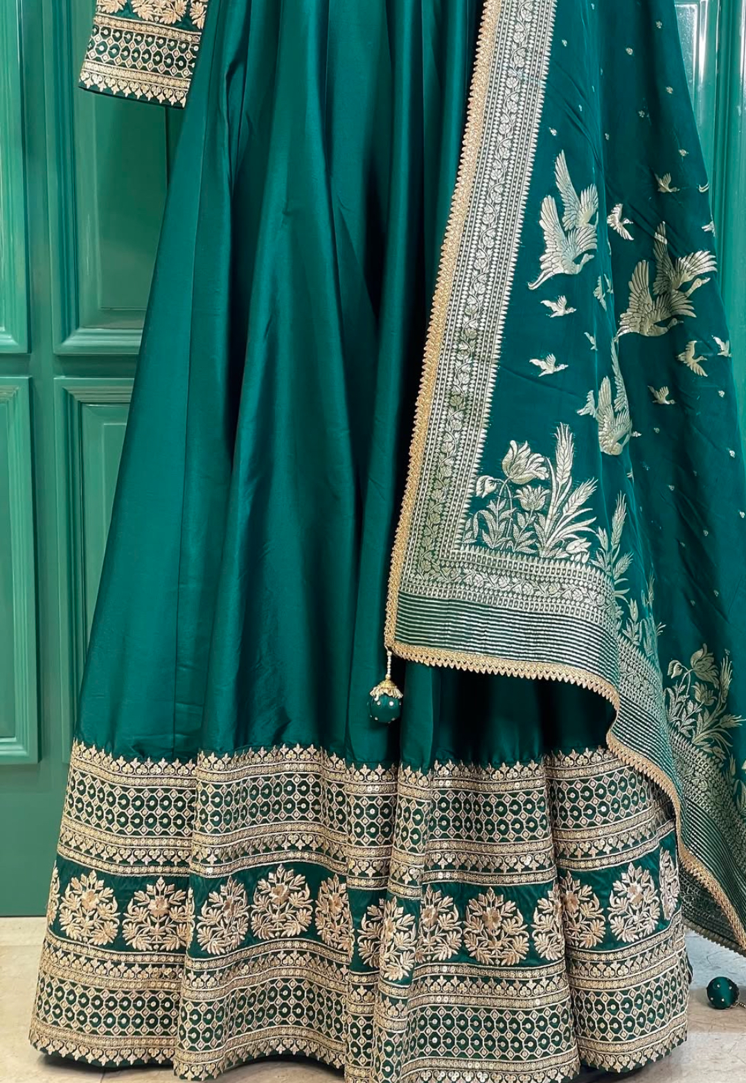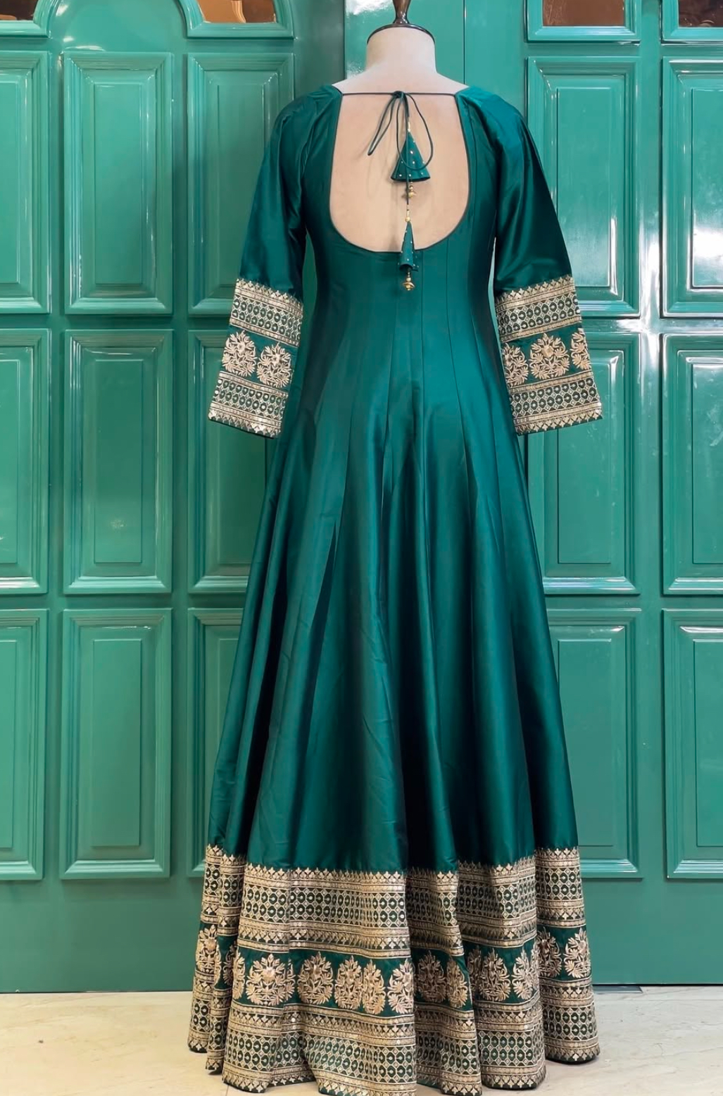 Unveil your regal charm with our Emerald Grace Anarkali, a timeless masterpiece crafted for the modern Indian woman. This stunning teal ensemble exudes elegance with its intricately embroidered borders, adorned with heritage-inspired motifs. The rich fabric flows gracefully, making it perfect for weddings, festive occasions, or grand celebrations.