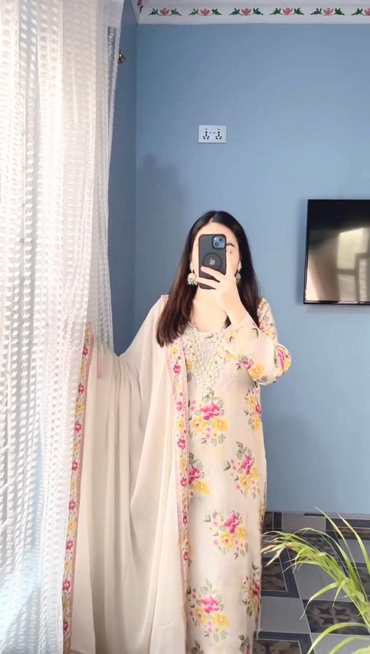 The Regal Pearl Organza Ensemble is absolutely stunning! The mirror work and digital print are so elegant, and the fabric feels luxurious. Perfect for festive occasions.