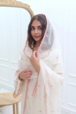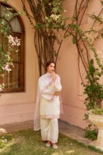 A pearl white Chanderi kurta set that boasts intricate floral motifs embroidered in soft shades of pink, green, and gold. The straight-cut kurta has a subtle sheen, giving it a regal look. It comes with matching pants and a lightweight dupatta, making it perfect for festive occasions.