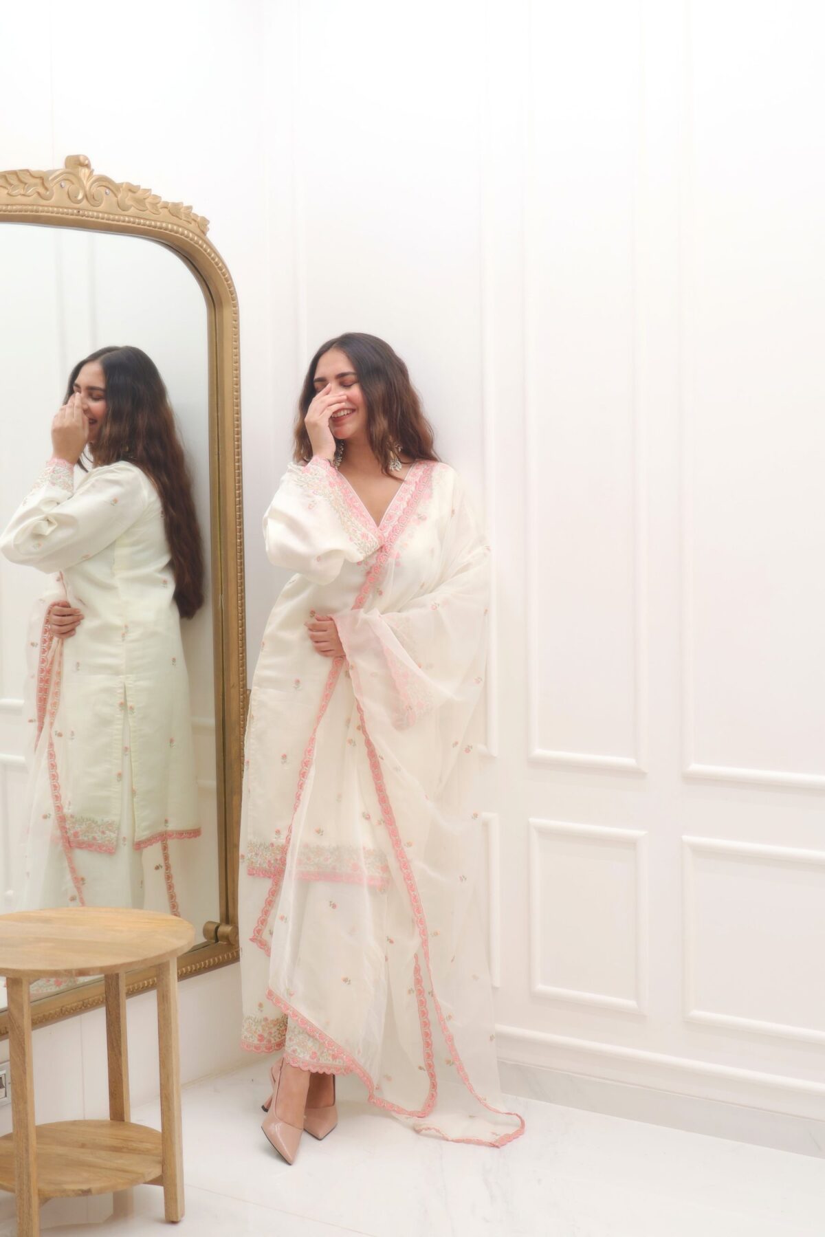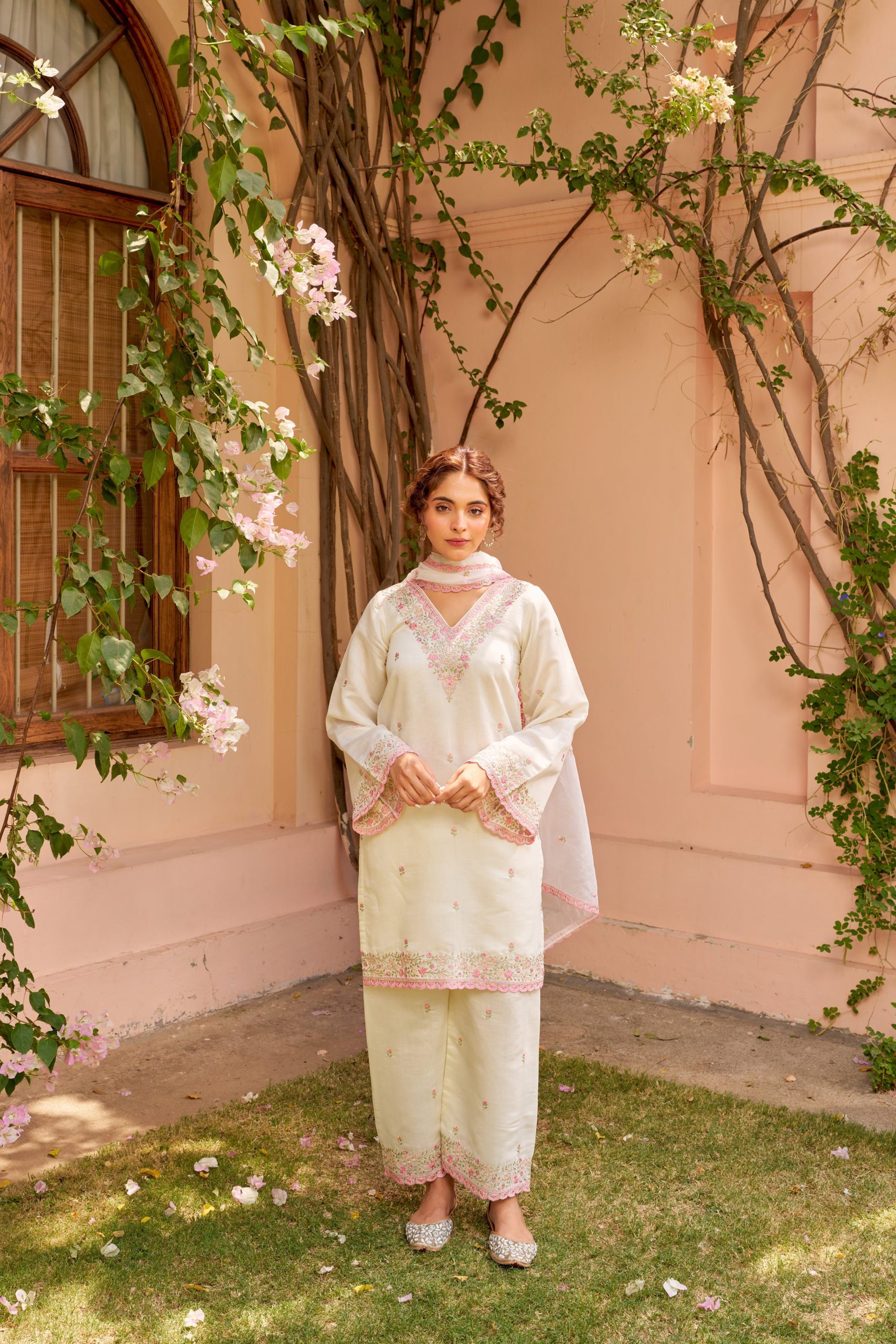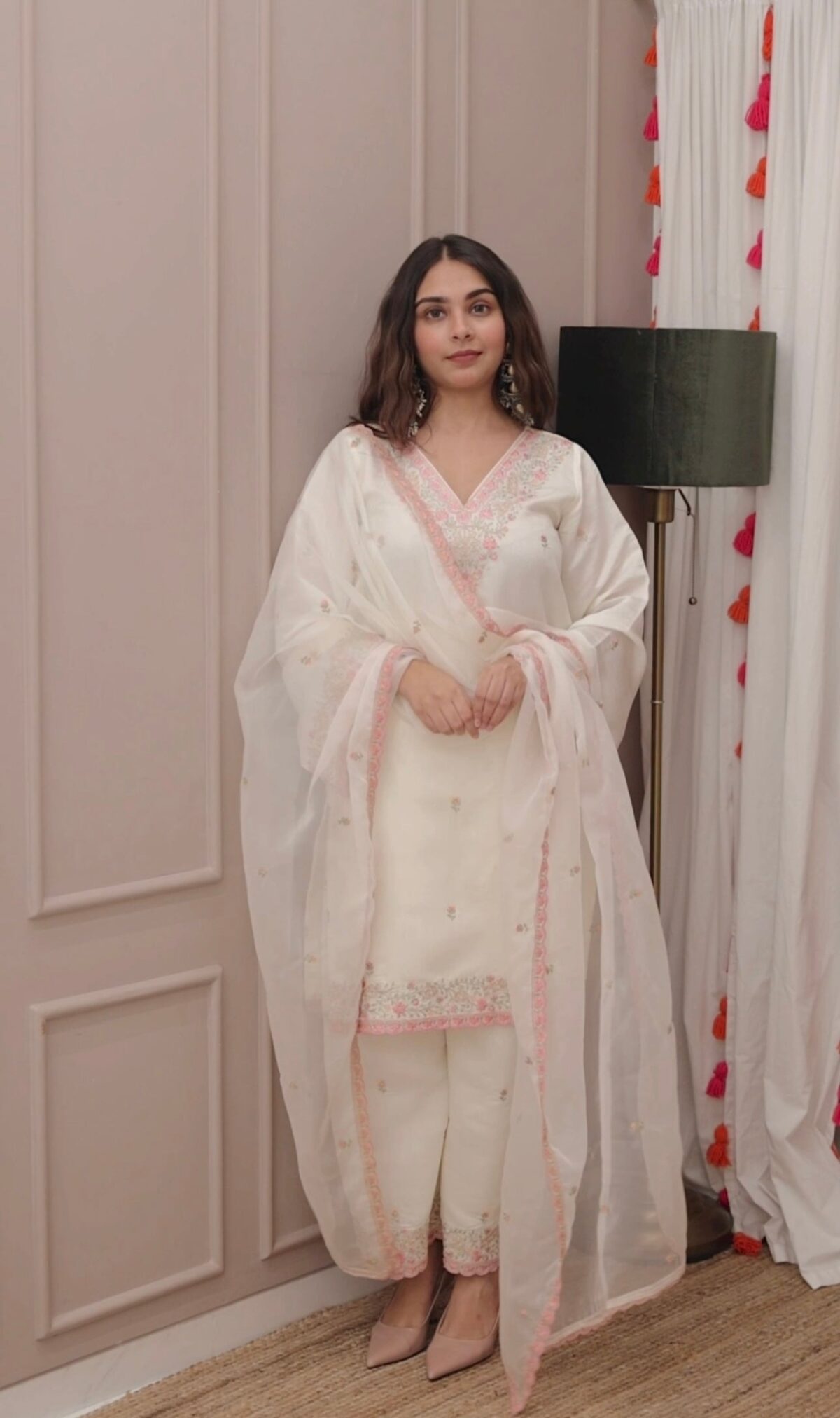 A pearl white Chanderi kurta set that boasts intricate floral motifs embroidered in soft shades of pink, green, and gold. The straight-cut kurta has a subtle sheen, giving it a regal look. It comes with matching pants and a lightweight dupatta, making it perfect for festive occasions.