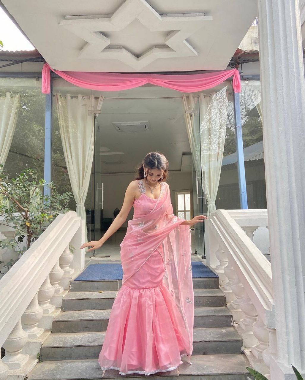 The Petals in Morning Mist lehenga saree is an ethereal masterpiece, crafted from soft organza in a delicate shade of light pink that resembles the gentle blush of dawn. This enchanting saree lehenga exudes elegance and femininity, with sheer, flowing layers that capture the essence of early morning mist resting on fresh petals.
