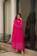 Indulge in feminine elegance with this stunning pink faux georgette Anarkali suit. Exquisitely adorned with intricate thread embroidery and shimmering sequins, this ensemble is a masterpiece of craftsmanship. The flowing silhouette of the Anarkali, coupled with the delicate fabric, creates a graceful and ethereal look.