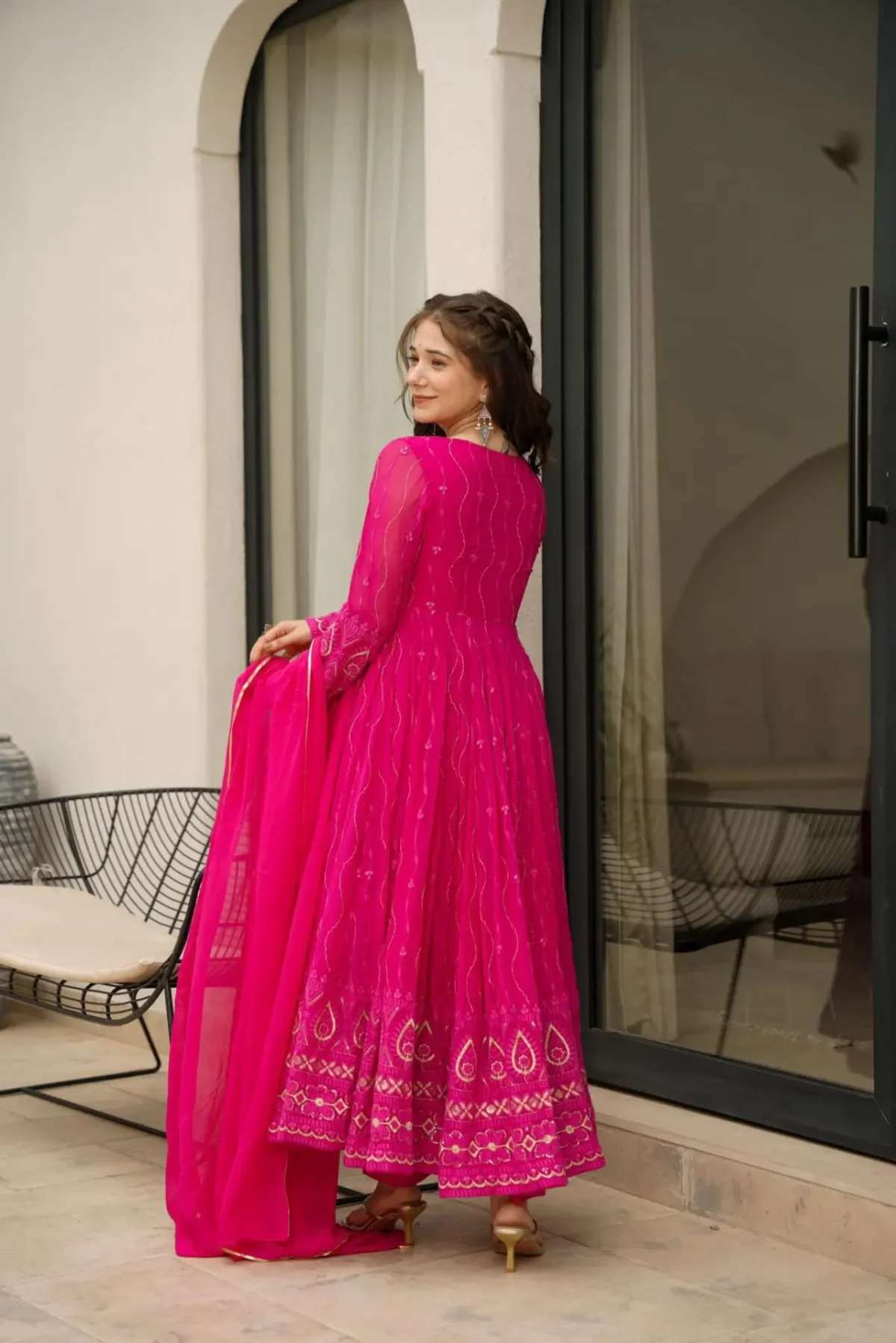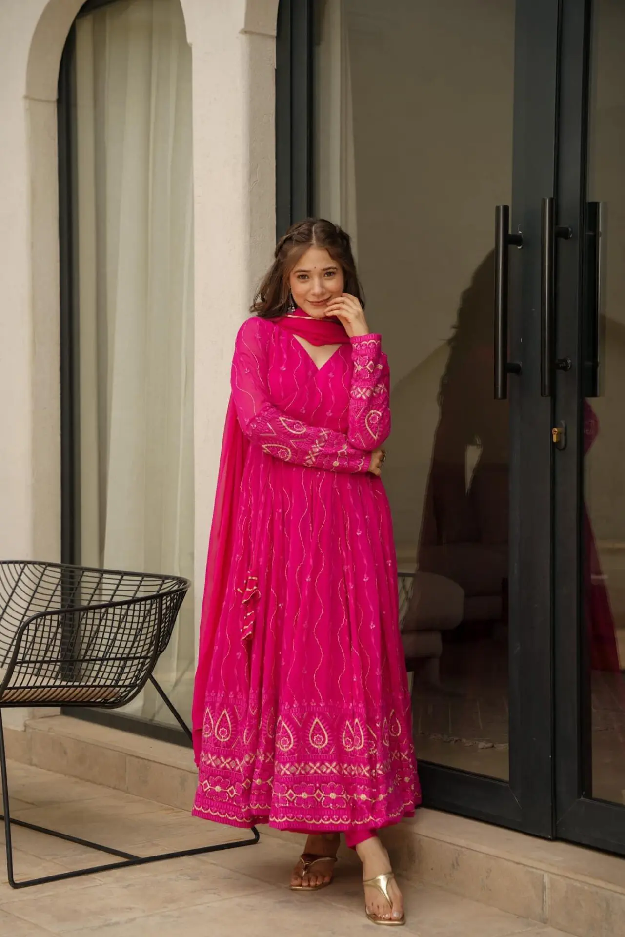 Experience the perfect blend of traditional and contemporary fashion with this enchanting Pink Faux Georgette Sequence and Thread Embroidered Anarkali.
