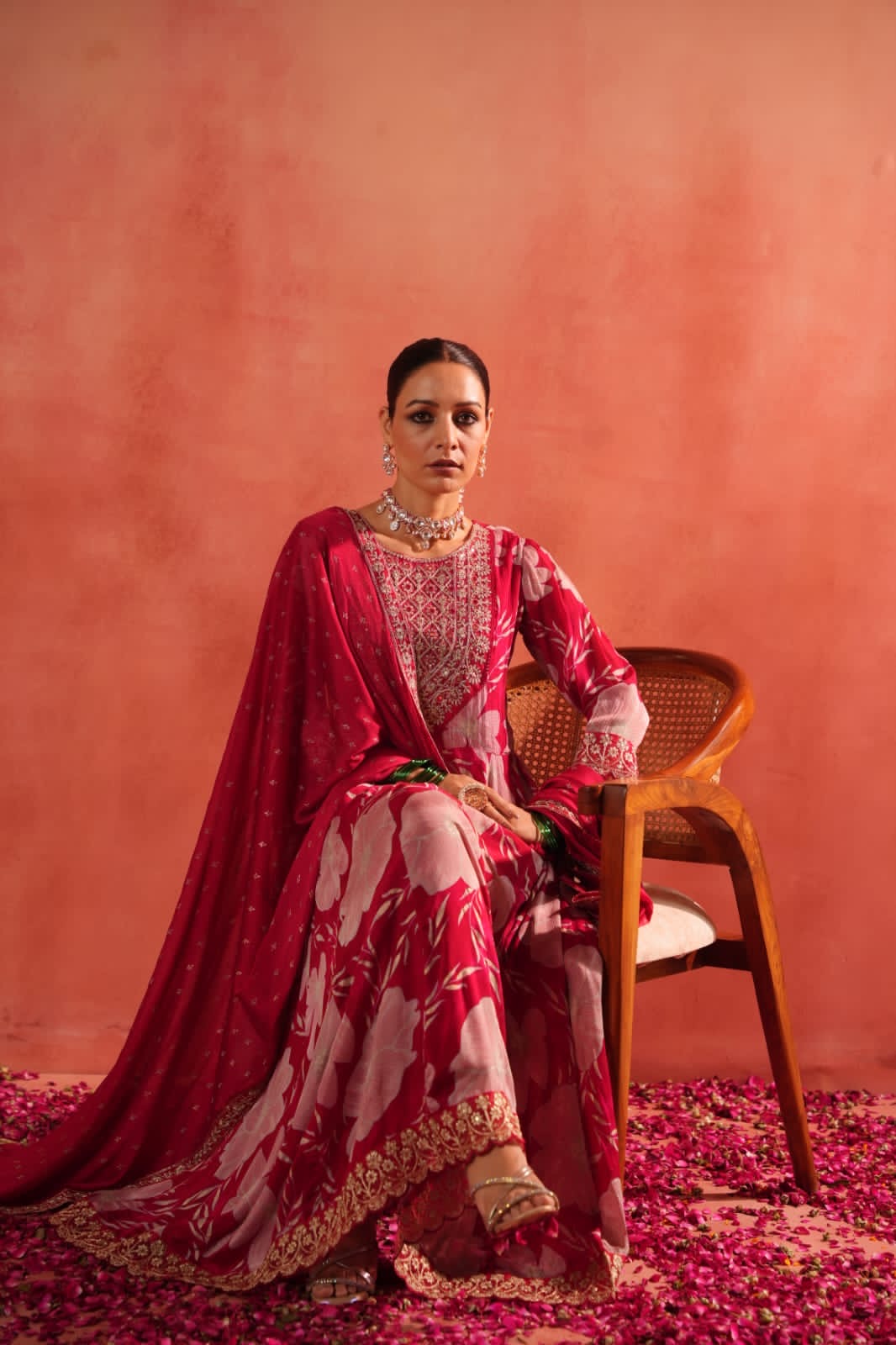 5 reviews for Premium Chinnon Floral Anarkali Suit Set With Dupatta