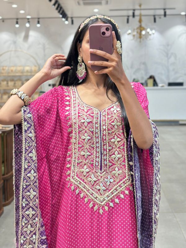 Absolutely stunning kaftan! The Chinon silk feels so luxurious, and the mirror work adds a festive charm. Perfect for evening gatherings.