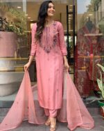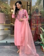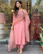 Introducing the Rose Blush Embroidered Chanderi Suit Set, a delicate fusion of grace and elegance. This beautiful suit set, crafted in a dreamy blush pink, is adorned with intricate floral embroidery that adds a subtle sparkle to your look.