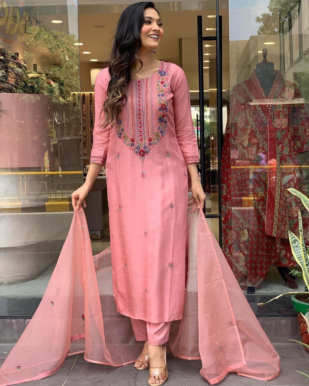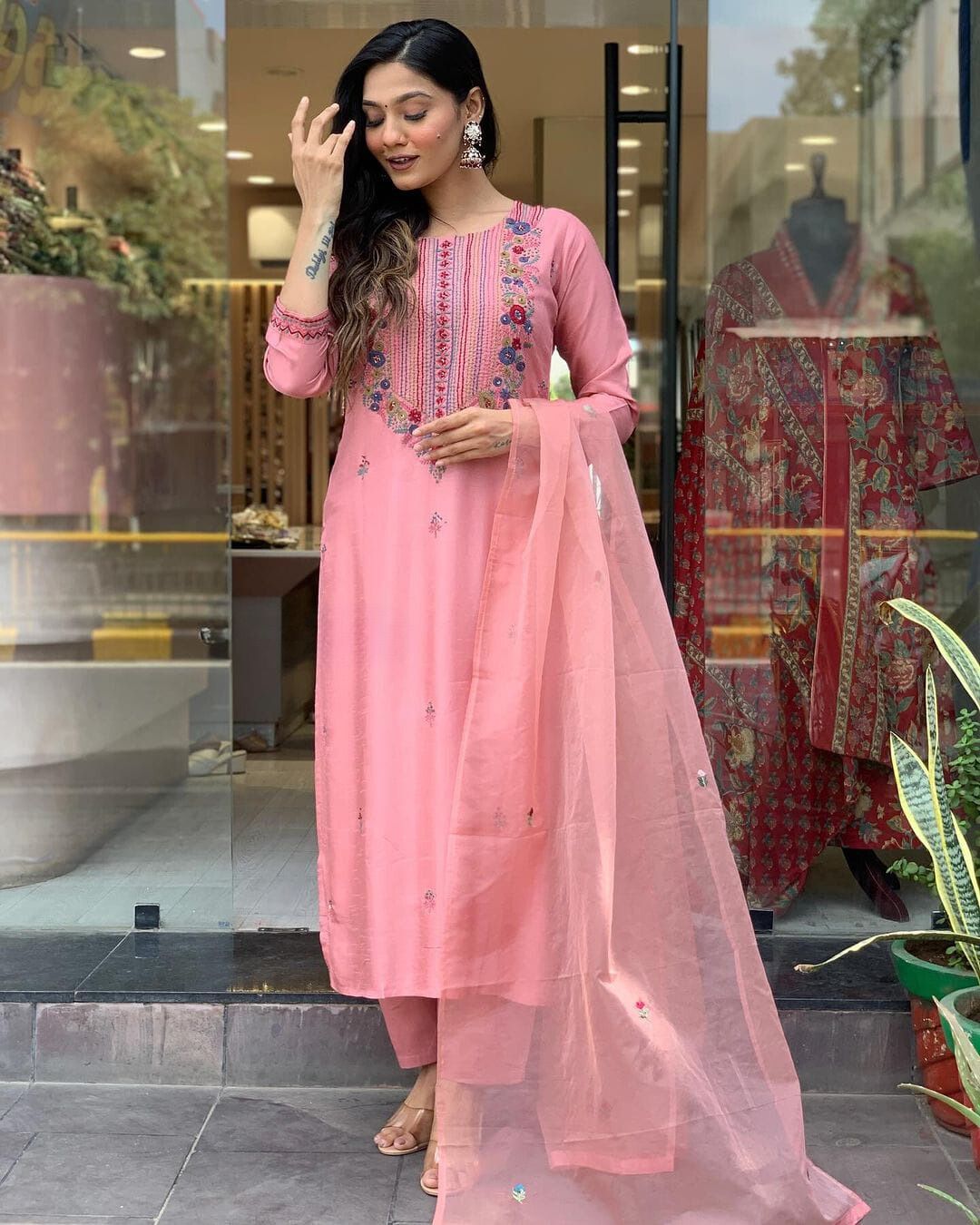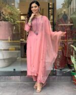 The airy organza dupatta drapes effortlessly, enhancing the charm of the outfit, while the soft, flowy fabric ensures comfort without compromising on style. Perfect for festive gatherings or special celebrations, this ensemble brings out the feminine elegance in every step.