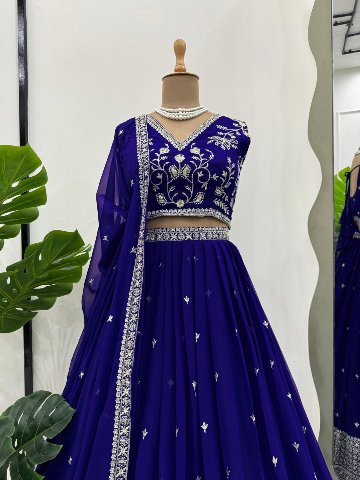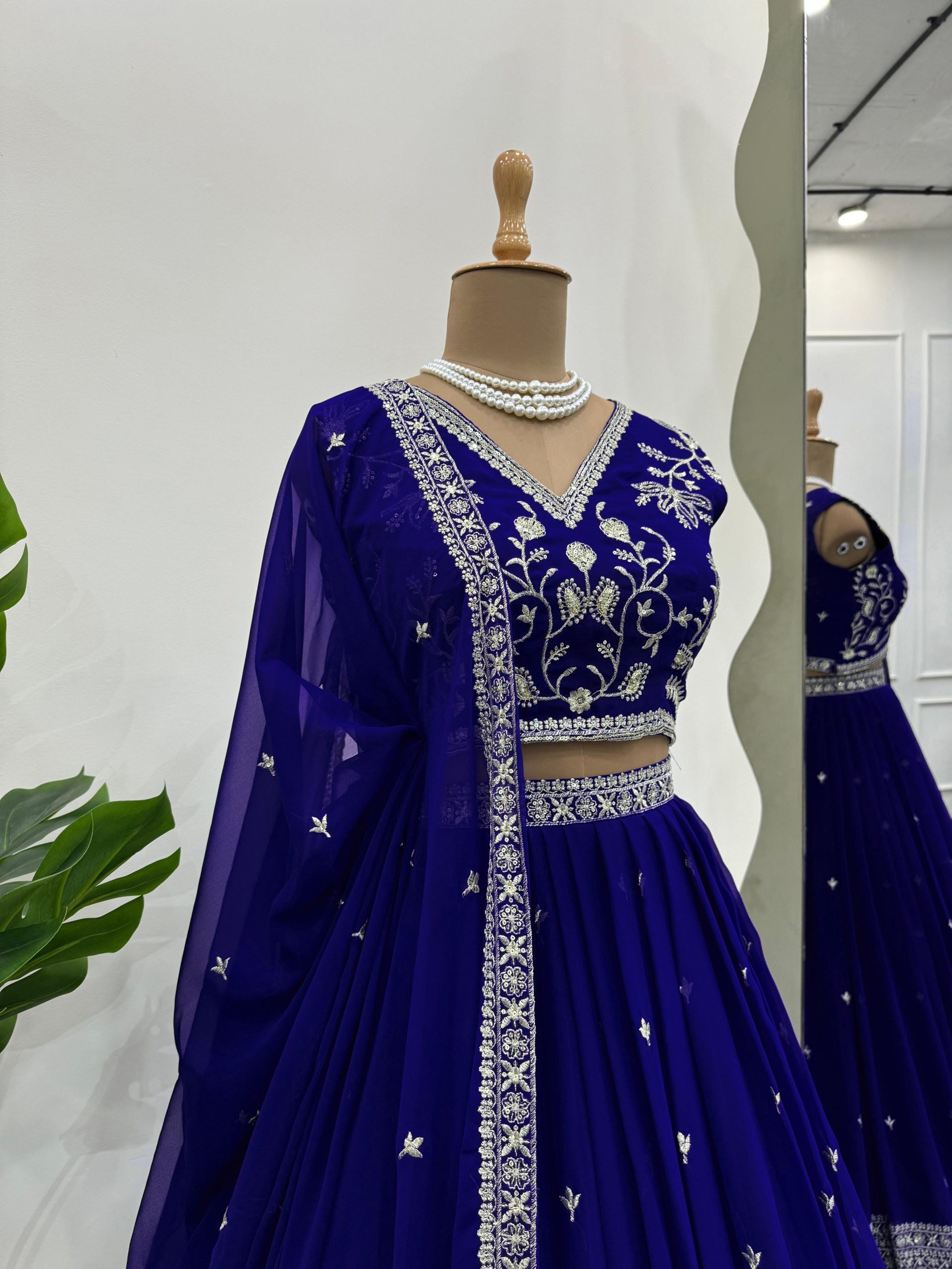 Immerse yourself in regal elegance with the Royal Blue Embroidered Lehenga Choli with Dupatta. This exquisite ensemble is perfect for making a grand statement at any festive or formal occasion. This stunning lehenga choli set is designed to enhance your beauty and poise, with its luxurious fabric and meticulous craftsmanship. The rich royal blue color, combined with intricate silver embroidery, ensures you stand out with grace and sophistication. Perfect for weddings, festivals, and special occasions, this ensemble will make you feel like royalty.