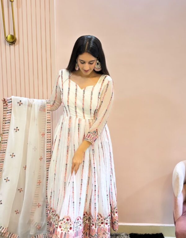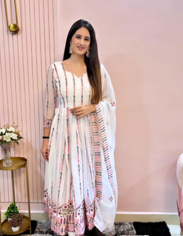 Bahut hi sundar kurti aur dupatta hai! Mirror work aur sequence design bilkul classy lag raha hai.