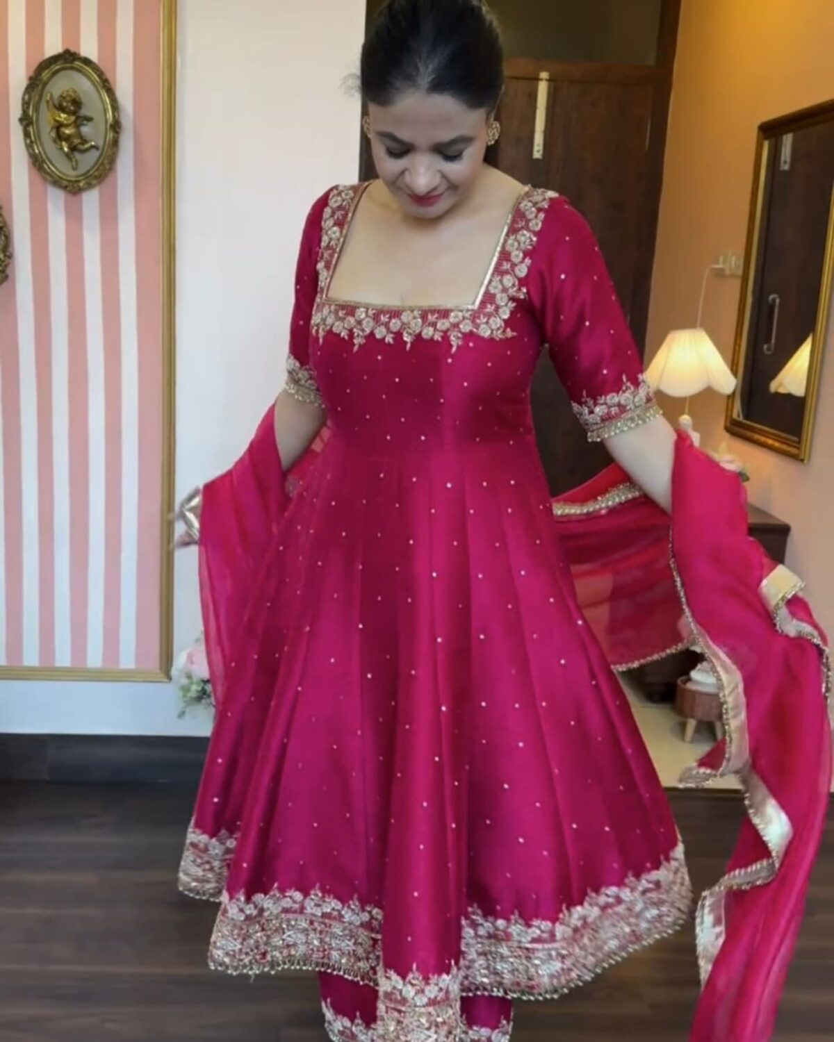 Yeh Anarkali toh bilkul showstopper hai! Dupatta ka lace border aur flair ka look ekdum royal lagta hai.