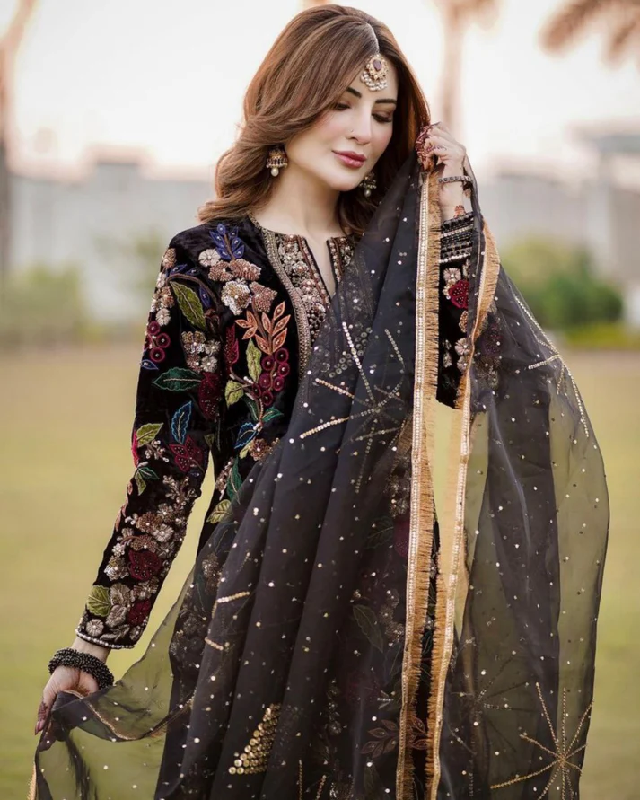Absolutely stunning set! The velvet fabric feels luxurious and the embroidery work is so intricate. Perfect for weddings and parties.