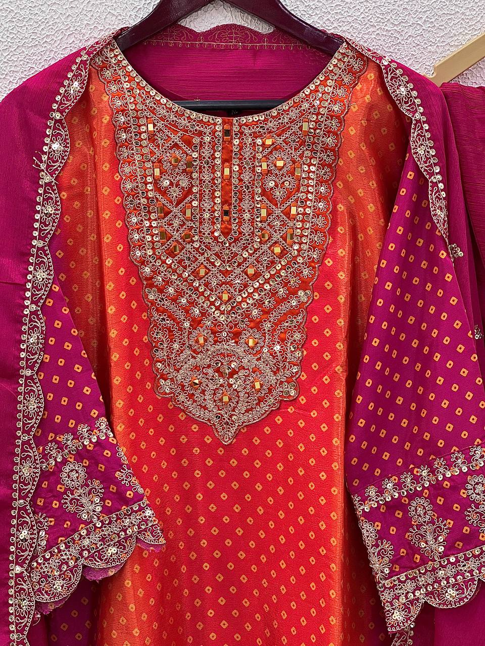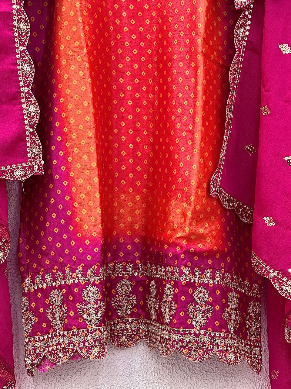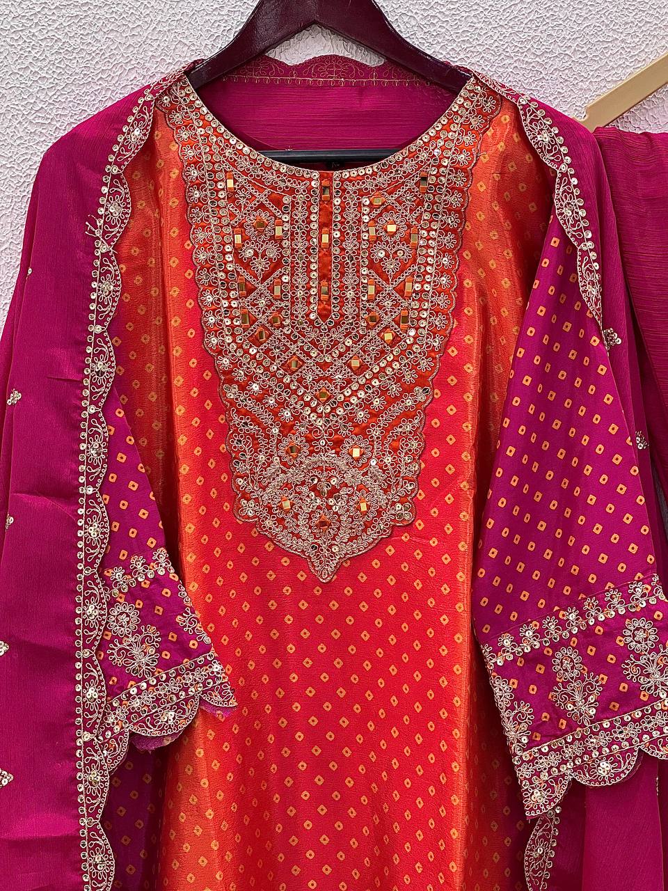 This exquisite ensemble✨ showcases luxurious Pure Chinon fabric adorned with intricate embroidery, coding, dori, and sequin work 🌟, accentuated by real mirror detailing for a stunning finish💎. With a flattering, ready-to-wear fit 👗, the set includes a beautifully embroidered dupatta and comfortable, elegant pants 👖—perfect for making a statement at any special occasion 🎉. Indulge in the elegance and charm of traditional craftsmanship combined with contemporary style.