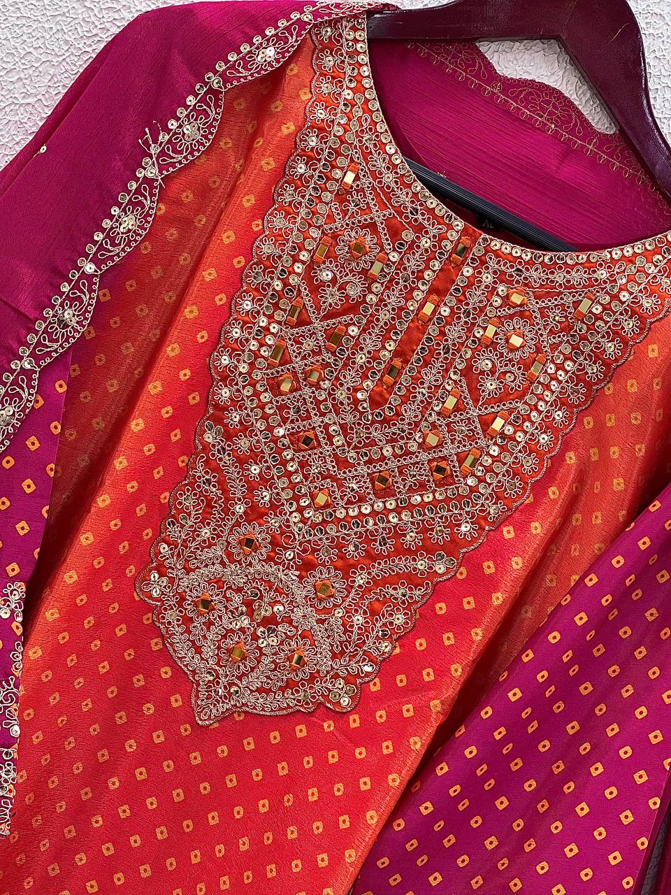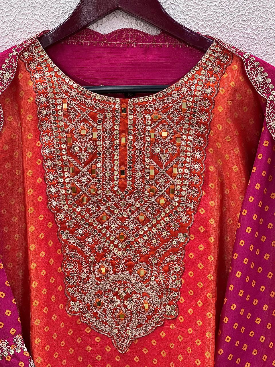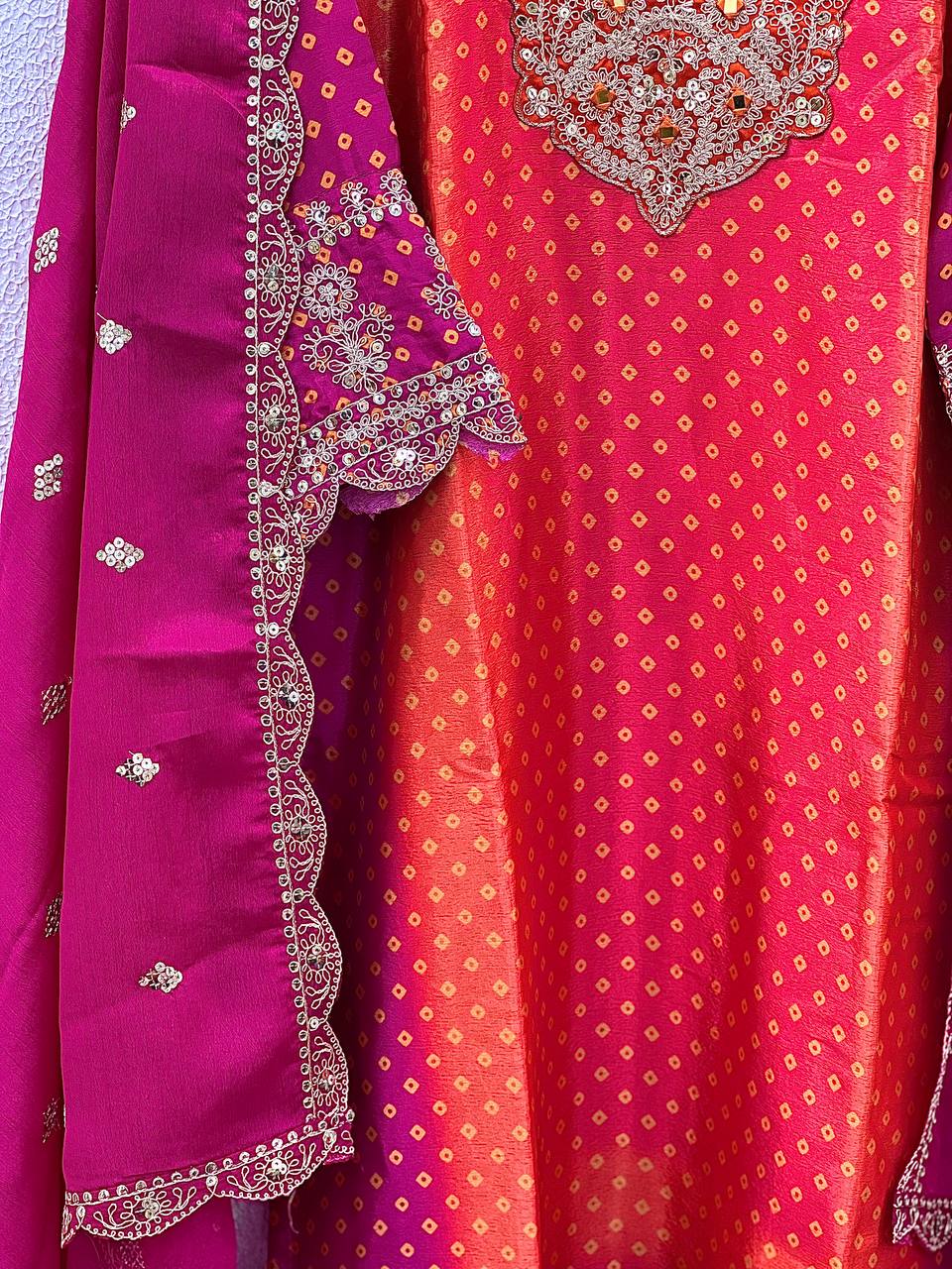This exquisite ensemble✨ showcases luxurious Pure Chinon fabric adorned with intricate embroidery, coding, dori, and sequin work 🌟, accentuated by real mirror detailing for a stunning finish💎. With a flattering, ready-to-wear fit 👗, the set includes a beautifully embroidered dupatta and comfortable, elegant pants 👖—perfect for making a statement at any special occasion 🎉. Indulge in the elegance and charm of traditional craftsmanship combined with contemporary style.