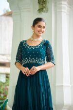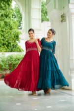 The gown is absolutely stunning! The maroon and teal combination looks regal, and the fabric feels premium. Perfect for weddings!