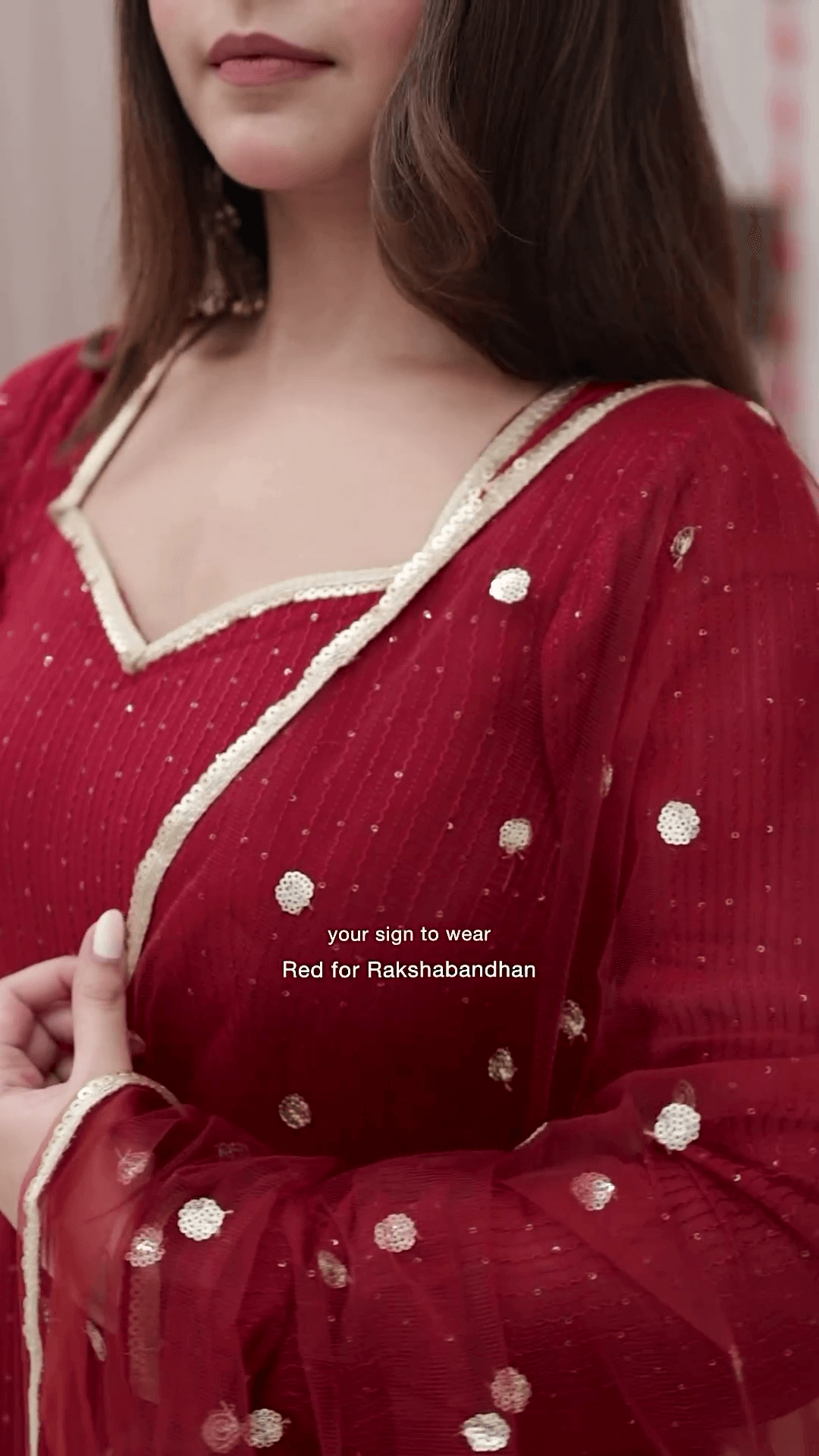 The Scarlet Elegance Anarkali Set features a rich red Anarkali gown adorned with subtle shimmering details, exuding timeless grace. Paired with a matching dupatta embellished with delicate polka dot accents and light embroidery, this outfit creates a regal and flowing silhouette. Perfect for weddings, festive events, or special occasions, this ensemble captures a blend of tradition and modern sophistication.