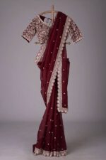 The saree looks absolutely stunning! The shimmer in the maroon color is perfect for weddings and festive occasions.