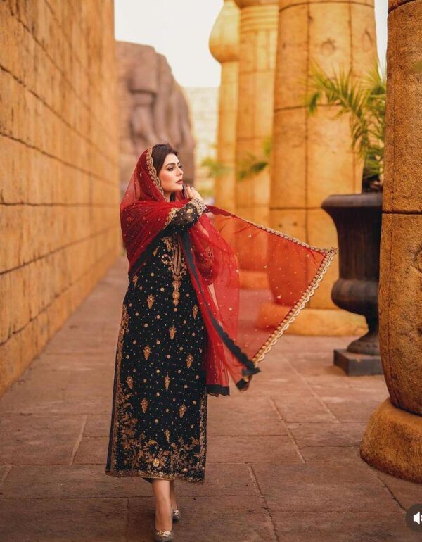 Yeh outfit bohot hi classy hai! Dupatta ka embroidery aur scalloped edges kaafi sundar lag rahe hain. Bilkul festive vibes deta hai.