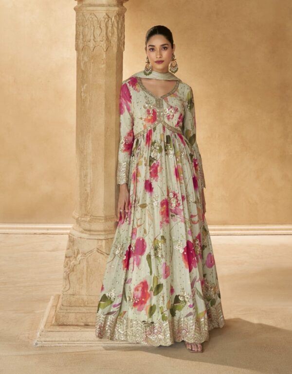 - Intricate Embellishments: Delicate sequin and zari work on the sleeve openings, anarkali hemline, and dupatta border add a touch of opulence.