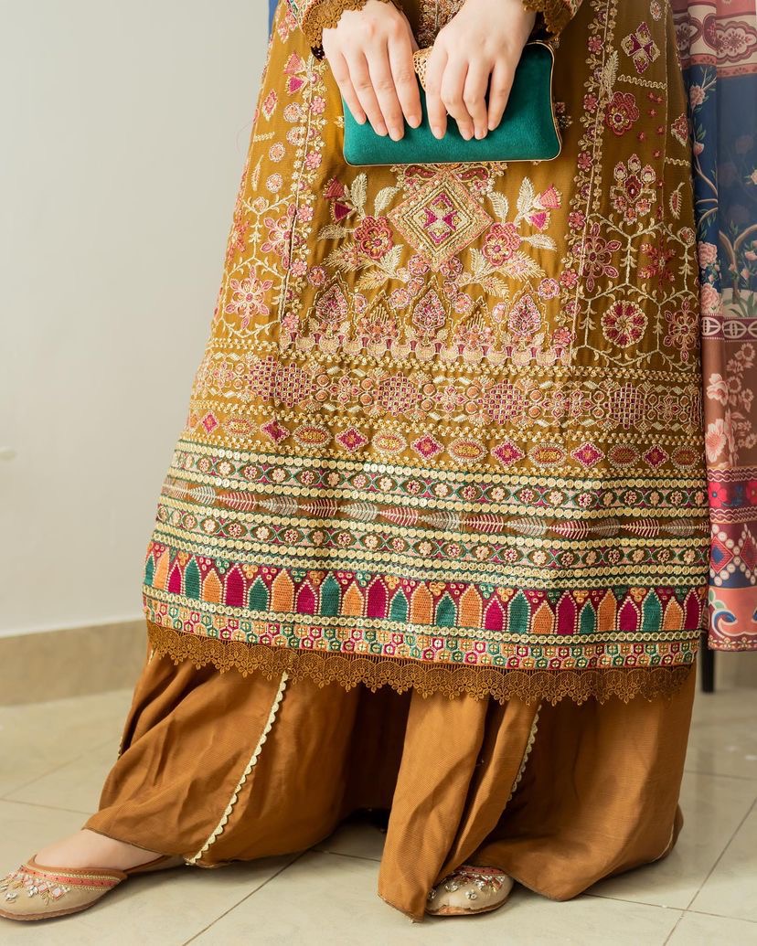 The Sunehri Afsana Sharara Set is a stunning blend of traditional charm and contemporary elegance. Crafted in rich golden hues, this outfit features intricate embroidery, a vibrant dupatta, and a graceful sharara, making it perfect for festive occasions and celebrations. Step into timeless beauty with this exquisite ensemble.