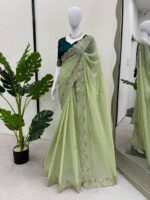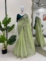 The saree is absolutely stunning! The silk has a beautiful shine, and the green color is so elegant. Perfect for weddings.