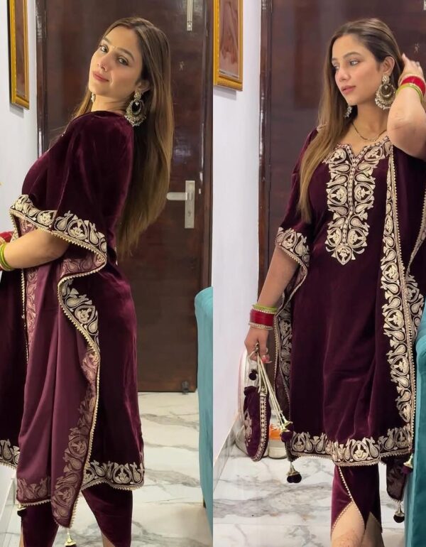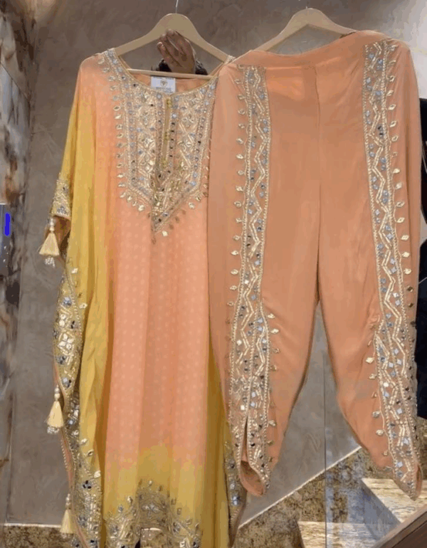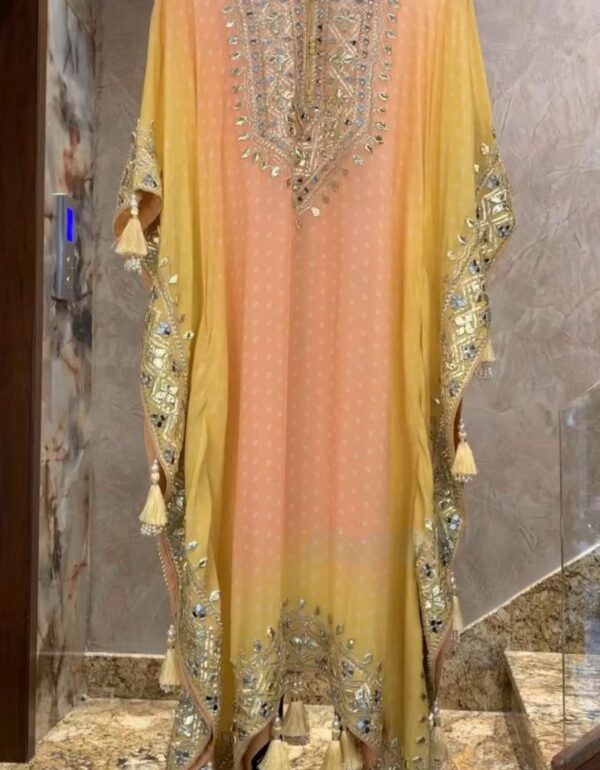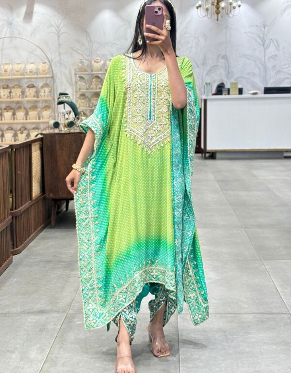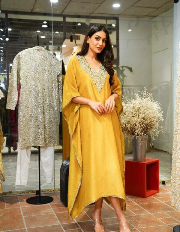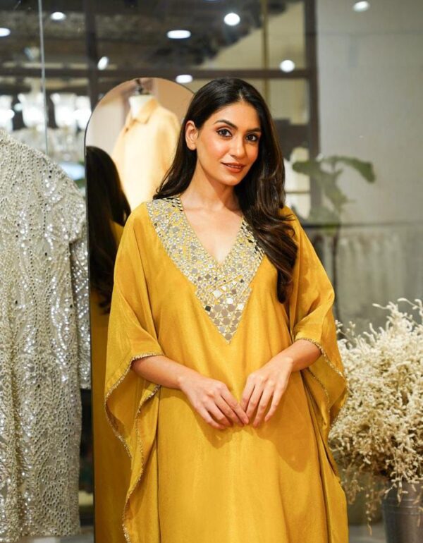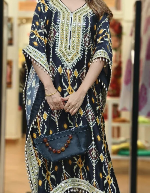 Yeh kaftan set bohot hi sundar hai! Silk ka fabric aur embroidery dono hi premium lagte hain. Tassels ka touch bhi unique hai.