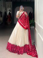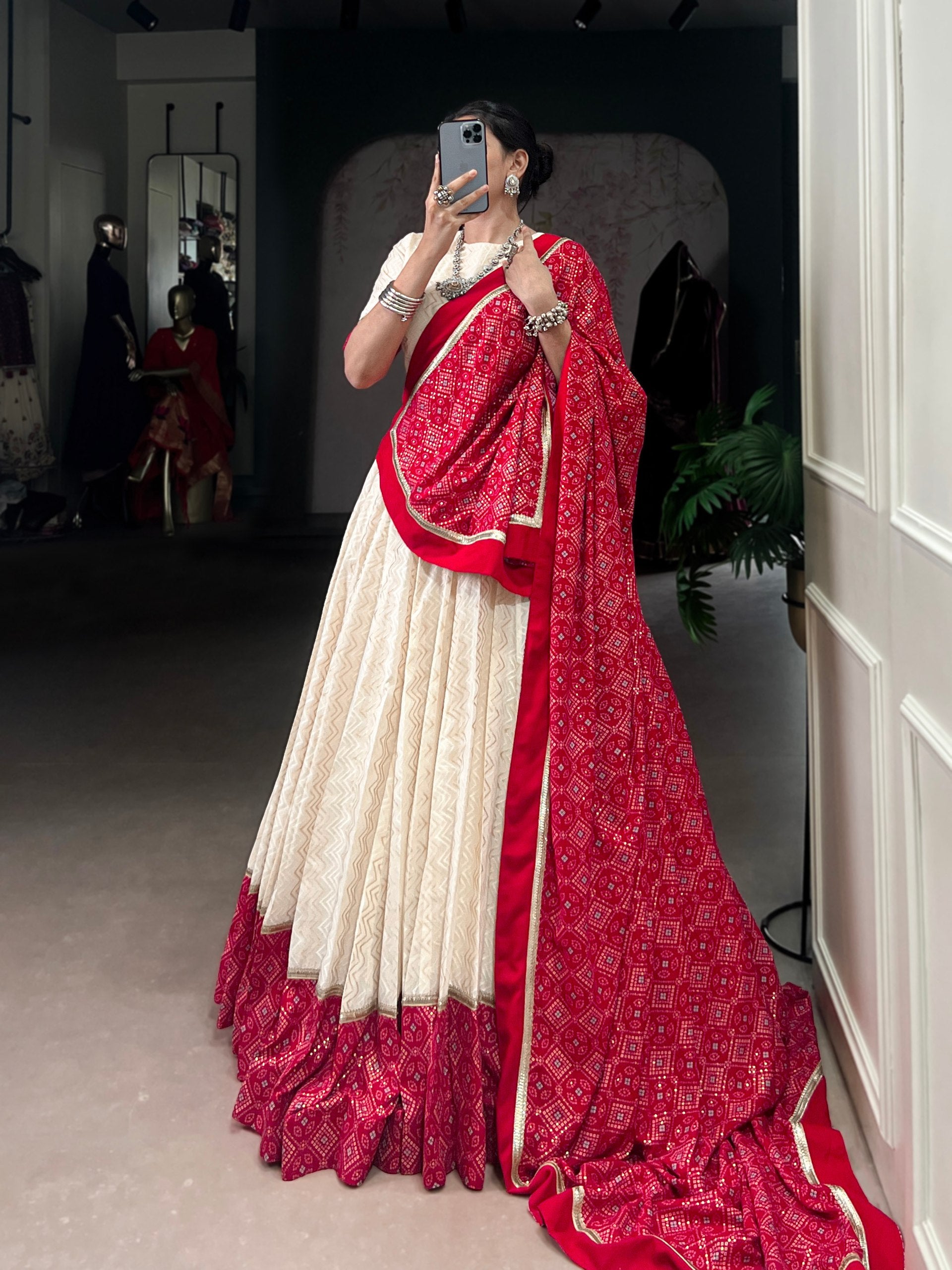 The lehenga is absolutely stunning! The ivory and scarlet combination is so elegant, and the fabric feels premium. Perfect for weddings!