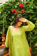 Elevate your wardrobe with this effortlessly stylish ensemble. The crisp apple green kurta, crafted for comfort and elegance, pairs perfectly with the matching jacket. This versatile set can be dressed up or down, making it ideal for various occasions. Whether you’re heading to a casual gathering or a formal event, this duo offers a modern twist on traditional wear. Experience the perfect blend of style and comfort with this stunning green set.