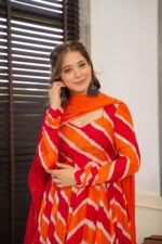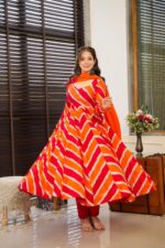 Indulge in the exquisite charm of the Vibrant Sunset Leheria Striped Anarkali Suit, a perfect blend of tradition and modernity. Elevate your style effortlessly with this stunning ensemble, designed to make a lasting impression.