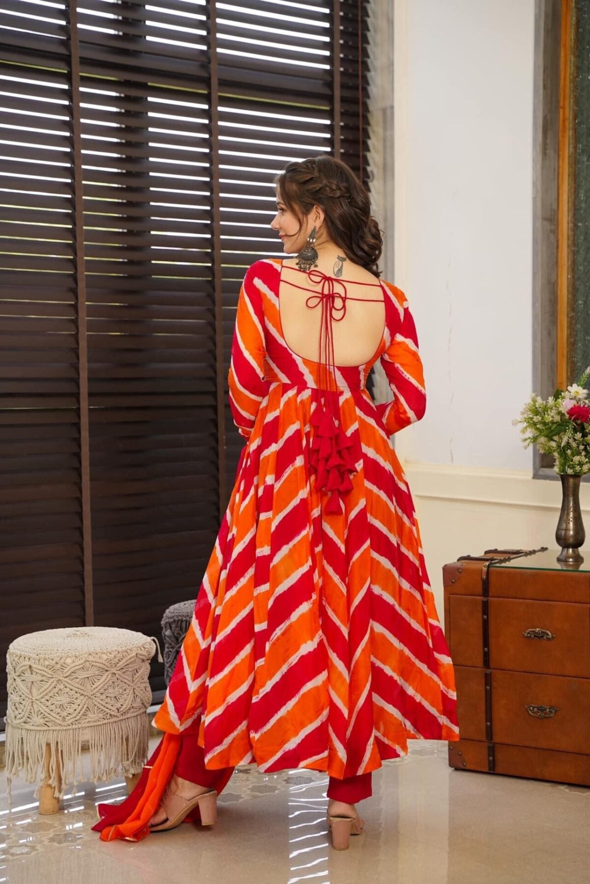 Indulge in the exquisite charm of the Vibrant Sunset Leheria Striped Anarkali Suit, a perfect blend of tradition and modernity. Elevate your style effortlessly with this stunning ensemble, designed to make a lasting impression.