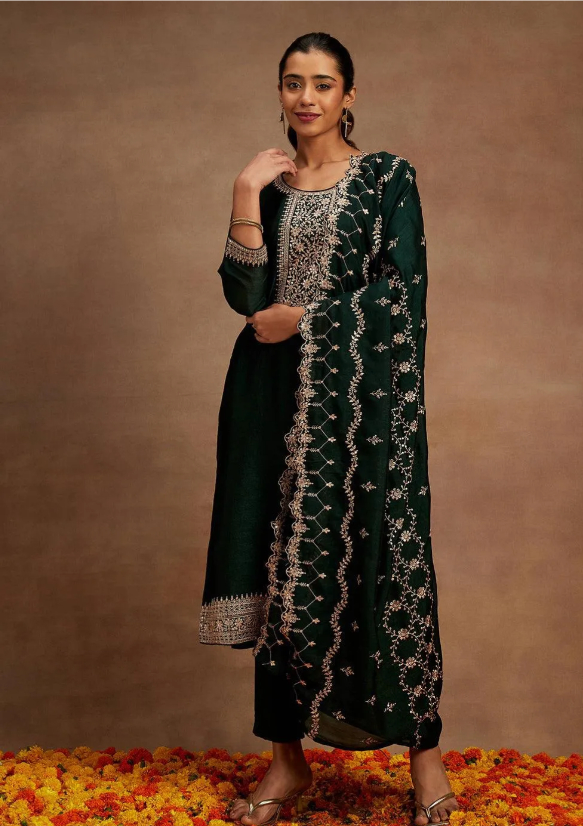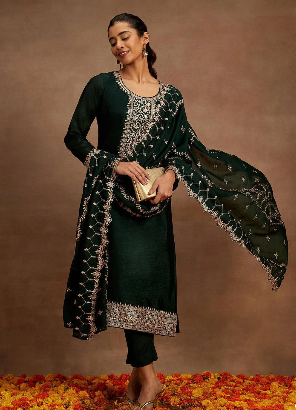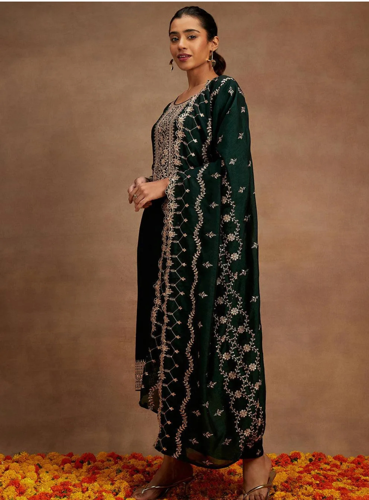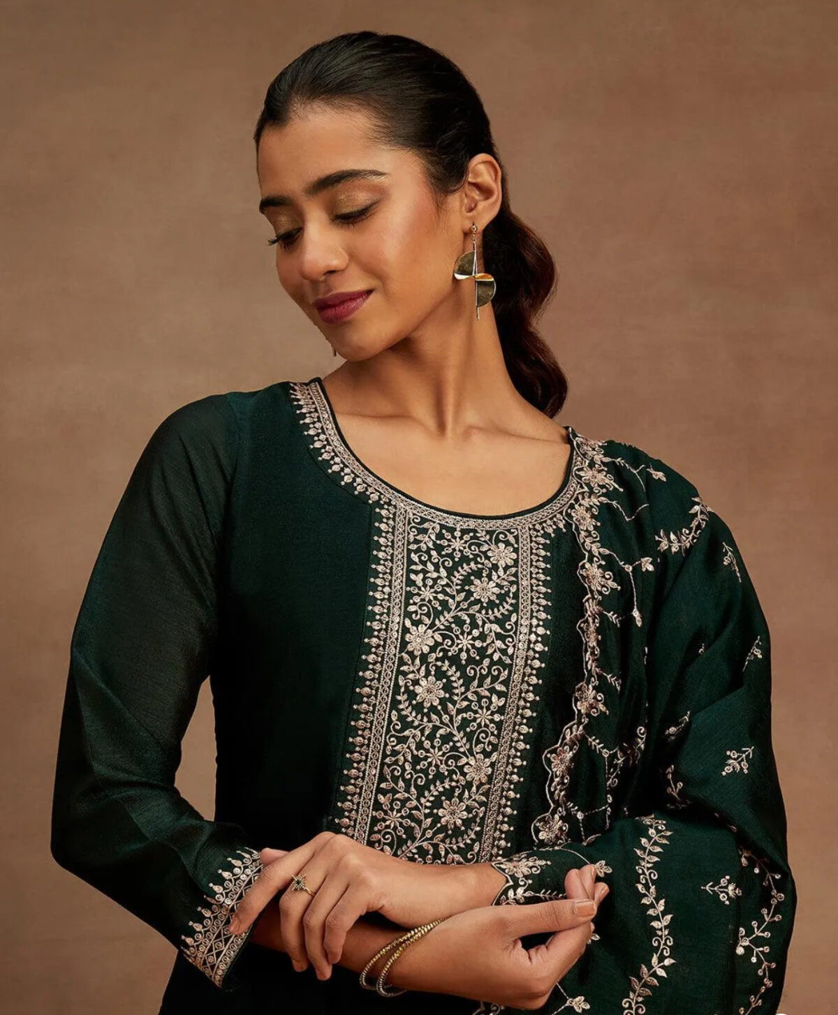 The suit set is absolutely stunning! The embroidery is so intricate and the bottle green color is perfect for festive occasions. Highly recommend it!