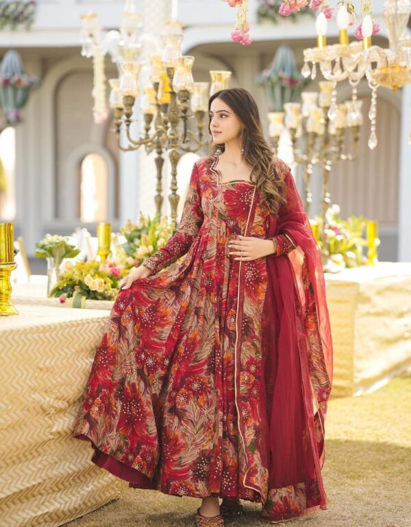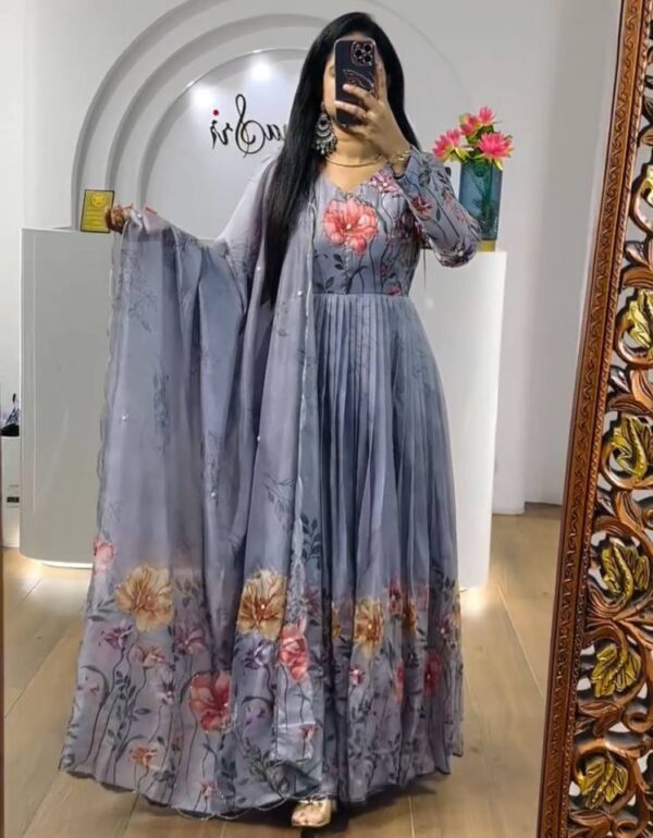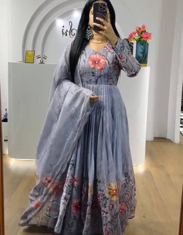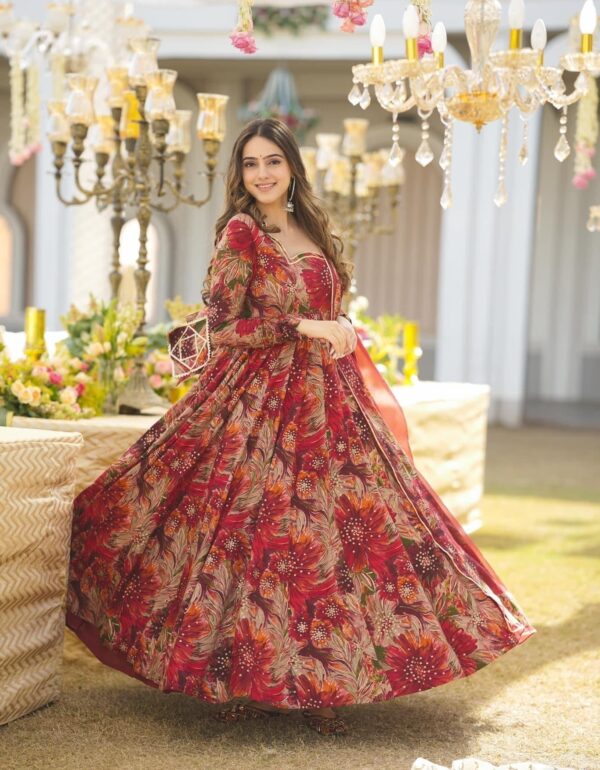 Model Height: 5.5 Model Is Wearing : M Size Gown :Fabric – ChinonWork – Floral Print Design WorkFlair : 4.50mtrHeight