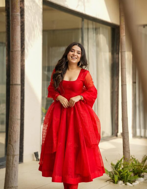 Model Height: 5.5 Model Is Wearing : M Size Gown :Fabric – OrganzaWork – Embroidery Sequence Design WorkFlair : 4.50mtrHeight