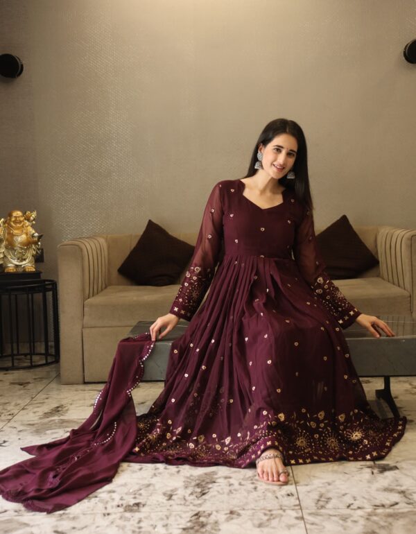 Model Height: 5.5 Model Is Wearing : M Size Gown :Fabric – Georgette Work – Embroidery Sequence Design WorkFlair : 4.50mtrHeight