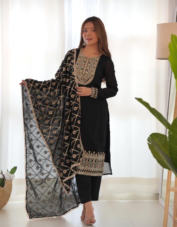 Model Height: 5.5 Model Is Wearing: M Size Suit :Fabric –: Pure Blooming Vichitra Silk FabricWork – Beautiful Embroidery Sequence And Dori,thread Work