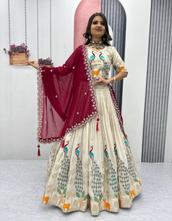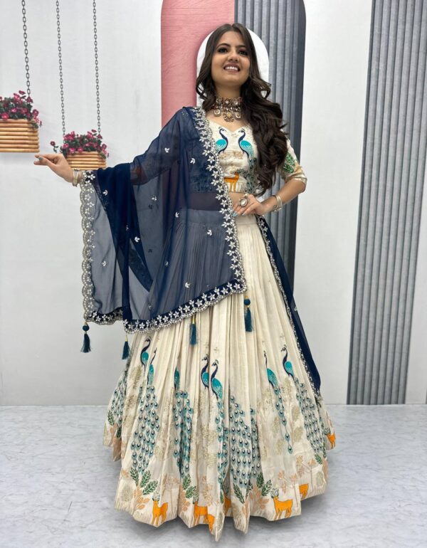 Model Height: 5.5 Model Is Wearing: M Size Lehenga : Lehenga Fabric – Pure Tissue SilkLehenga Work – Heavy Thread & Sequence WorkLength –