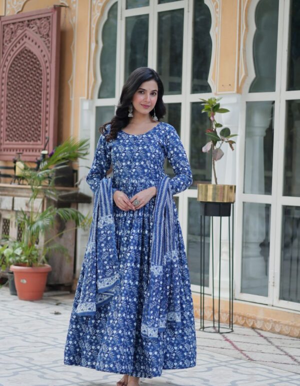 Model Height: 5.5 Model Is Wearing: M Size Gown : Fabric –Pure CottonLINING :- Cotton (Half Inner Top only )Neck – Fancy Round NeckLength