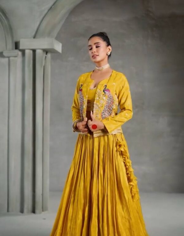 Kashavi Mustard Crop Top with Jacket Lehenga Choli