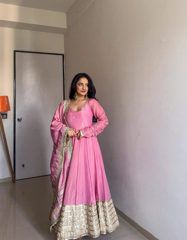 Model Is Wearing : M Size Gown :Fabric – Faux Blooming GeorgetteWork – Zari Thread & Sequins Embroidery.Flair : 4.50mtrHeight – 56 INCHLINING:- Cotton