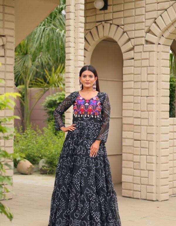 Model Height: 5.5 Model Is Wearing : M Size   GownFabric:-  Foux georgette Work: Embroidery Thread Work with real mirror & codi lace Inner:-